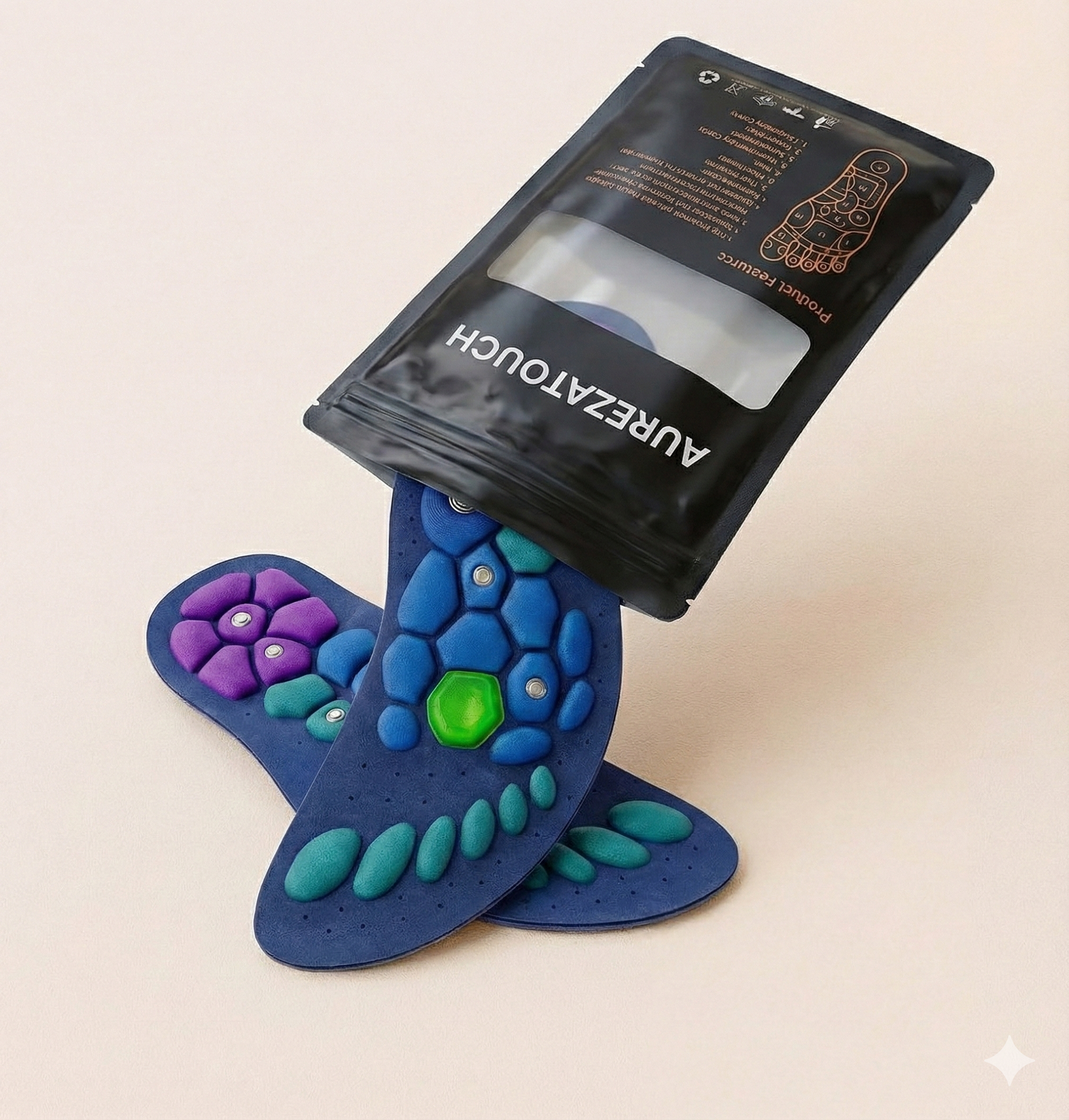 Improper footwear, intense exercise, and inadequate stretching may contribute to chronic arch pain and metatarsalgia. Fortunately, Aureza Touch™ advanced insoles utilize innovative magnetic therapy technology for gentle therapeutic massage, while specialized Acupressure Cushions precisely target key pressure points of the feet to enhance foot comfort and promote deep relaxation.